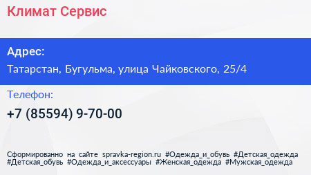 Климат-Сервис по адресу Татарстан, Бугульма, улица Чайковского, 25/4 в дальнейшем Организация, размещена в следующих категориях: