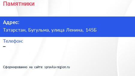 Памятники по адресу Татарстан, Бугульма, улица Ленина, 145Б в дальнейшем Организация, размещена в следующих категориях: