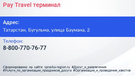 Pay.Travel, терминал по адресу Татарстан, Бугульма, улица Баумана, 2 в дальнейшем Организация, размещена в следующих категориях: