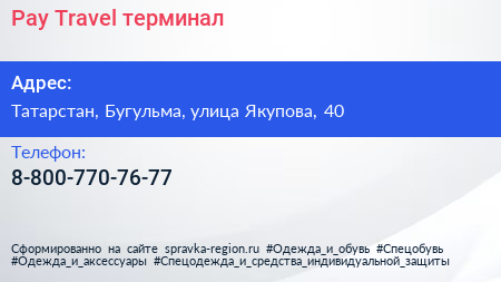 Pay.Travel, терминал по адресу Татарстан, Бугульма, улица Якупова, 40 в дальнейшем Организация, размещена в следующих категориях: