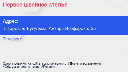 Первое швейное ателье по адресу Татарстан, Бугульма, Анвара Ягофарова, 35 в дальнейшем Организация, размещена в следующих категориях:
