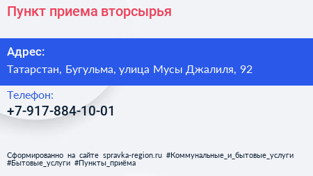 Пункт приема вторсырья по адресу Татарстан, Бугульма, улица Мусы Джалиля, 92 в дальнейшем Организация, размещена в следующих категориях: