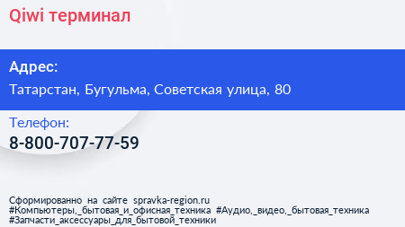 Qiwi, терминал по адресу Татарстан, Бугульма, Советская улица, 80 в дальнейшем Организация, размещена в следующих категориях: