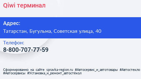 Qiwi, терминал по адресу Татарстан, Бугульма, Советская улица, 40 в дальнейшем Организация, размещена в следующих категориях: