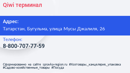 Qiwi, терминал по адресу Татарстан, Бугульма, улица Мусы Джалиля, 26 в дальнейшем Организация, размещена в следующих категориях:
