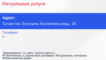 Ритуальные услуги по адресу Татарстан, Бугульма, Кузнечная улица, 18 в дальнейшем Организация, размещена в следующих категориях: