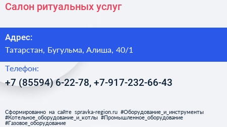 Салон ритуальных услуг по адресу Татарстан, Бугульма, Алиша, 40/1 в дальнейшем Организация, размещена в следующих категориях: