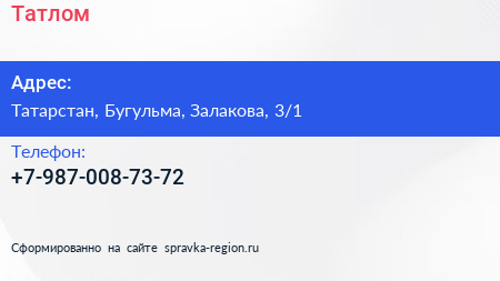 Татлом по адресу Татарстан, Бугульма, Залакова, 3/1 в дальнейшем Организация, размещена в следующих категориях: