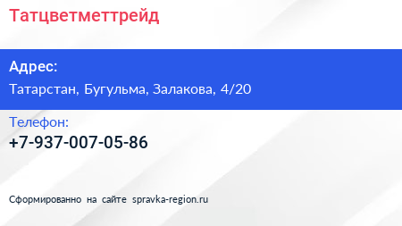 Татцветметтрейд по адресу Татарстан, Бугульма, Залакова, 4/20 в дальнейшем Организация, размещена в следующих категориях: