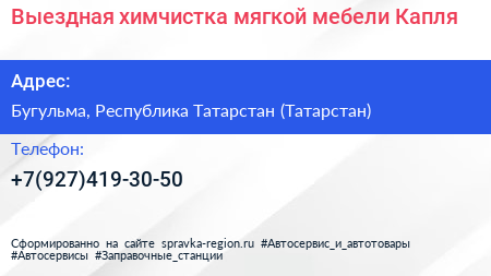 Выездная химчистка мягкой мебели Капля по адресу Бугульма, Республика Татарстан (Татарстан) в дальнейшем Организация, размещена в следующих категориях: