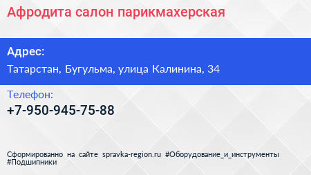 Афродита, салон-парикмахерская по адресу Татарстан, Бугульма, улица Калинина, 34 в дальнейшем Организация, размещена в следующих категориях: