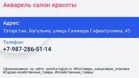 Акварель, салон красоты по адресу Татарстан, Бугульма, улица Газинура Гафиатуллина, 45 в дальнейшем Организация, размещена в следующих категориях: