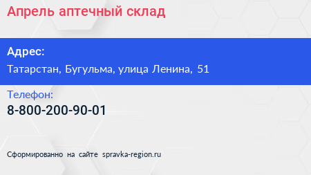 Апрель, аптечный склад по адресу Татарстан, Бугульма, улица Ленина, 51 в дальнейшем Организация, размещена в следующих категориях: