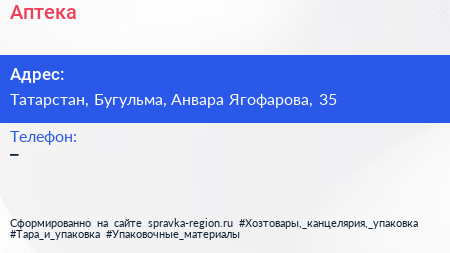 Аптека по адресу Татарстан, Бугульма, Анвара Ягофарова, 35 в дальнейшем Организация, размещена в следующих категориях: