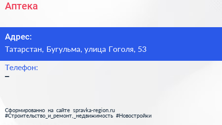 Аптека по адресу Татарстан, Бугульма, улица Гоголя, 53 в дальнейшем Организация, размещена в следующих категориях: