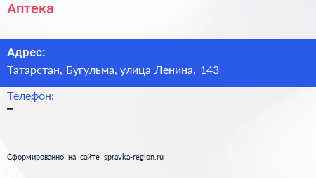 Аптека по адресу Татарстан, Бугульма, улица Ленина, 143 в дальнейшем Организация, размещена в следующих категориях: