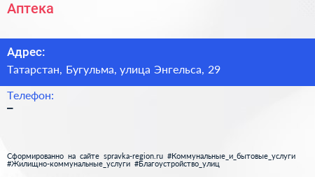 Аптека по адресу Татарстан, Бугульма, улица Энгельса, 29 в дальнейшем Организация, размещена в следующих категориях: