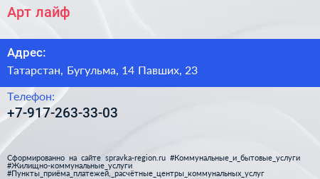 Арт лайф по адресу Татарстан, Бугульма, 14 Павших, 23 в дальнейшем Организация, размещена в следующих категориях: