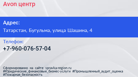 Avon, центр по адресу Татарстан, Бугульма, улица Шашина, 4 в дальнейшем Организация, размещена в следующих категориях: