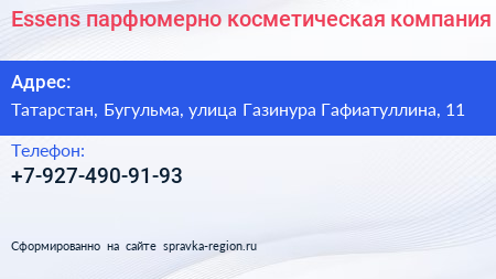 Essens, парфюмерно-косметическая компания по адресу Татарстан, Бугульма, улица Газинура Гафиатуллина, 11 в дальнейшем Организация, размещена в следующих категориях: