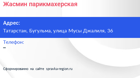 Жасмин, парикмахерская по адресу Татарстан, Бугульма, улица Мусы Джалиля, 36 в дальнейшем Организация, размещена в следующих категориях: