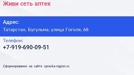 Живи, сеть аптек по адресу Татарстан, Бугульма, улица Гоголя, 68 в дальнейшем Организация, размещена в следующих категориях: