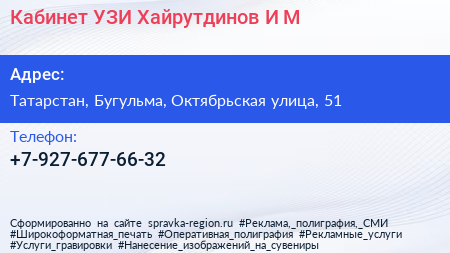 Кабинет УЗИ Хайрутдинов И.М. по адресу Татарстан, Бугульма, Октябрьская улица, 51 в дальнейшем Организация, размещена в следующих категориях: