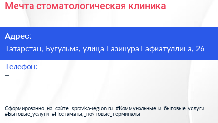 Мечта, стоматологическая клиника по адресу Татарстан, Бугульма, улица Газинура Гафиатуллина, 26 в дальнейшем Организация, размещена в следующих категориях:
