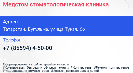 Медстом, стоматологическая клиника по адресу Татарстан, Бугульма, улица Тукая, 66 в дальнейшем Организация, размещена в следующих категориях: