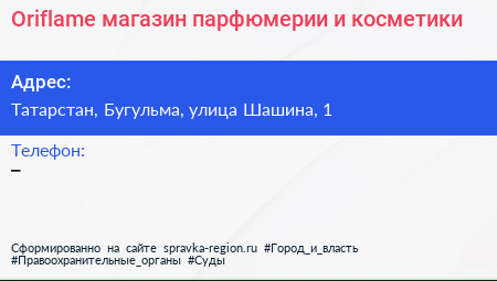 Oriflame, магазин парфюмерии и косметики по адресу Татарстан, Бугульма, улица Шашина, 1 в дальнейшем Организация, размещена в следующих категориях: