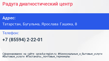 Радуга, диагностический центр по адресу Татарстан, Бугульма, Ярослава Гашека, 8 в дальнейшем Организация, размещена в следующих категориях: