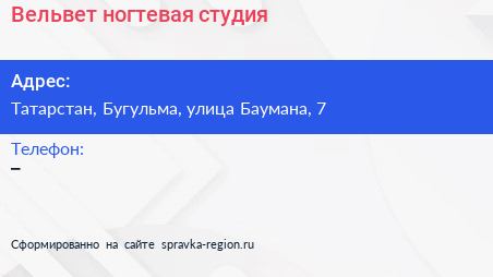 Вельвет, ногтевая студия по адресу Татарстан, Бугульма, улица Баумана, 7 в дальнейшем Организация, размещена в следующих категориях: