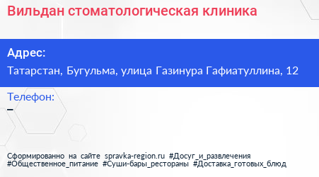 Вильдан, стоматологическая клиника по адресу Татарстан, Бугульма, улица Газинура Гафиатуллина, 12 в дальнейшем Организация, размещена в следующих категориях: