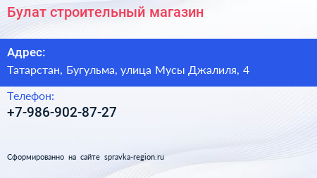Булат, строительный магазин по адресу Татарстан, Бугульма, улица Мусы Джалиля, 4 в дальнейшем Организация, размещена в следующих категориях: