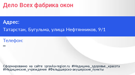 Дело Всех, фабрика окон по адресу Татарстан, Бугульма, улица Нефтянников, 9/1 в дальнейшем Организация, размещена в следующих категориях: