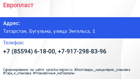 Европласт по адресу Татарстан, Бугульма, улица Энгельса, 1 в дальнейшем Организация, размещена в следующих категориях:
