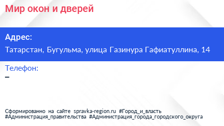 Мир окон и дверей по адресу Татарстан, Бугульма, улица Газинура Гафиатуллина, 14 в дальнейшем Организация, размещена в следующих категориях: