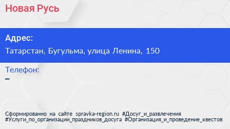Новая Русь по адресу Татарстан, Бугульма, улица Ленина, 150 в дальнейшем Организация, размещена в следующих категориях: