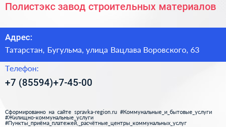 Полистэкс, завод строительных материалов по адресу Татарстан, Бугульма, улица Вацлава Воровского, 63 в дальнейшем Организация, размещена в следующих категориях: