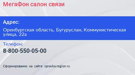 МегаФон, салон связи по адресу Оренбургская область, Бугуруслан, Коммунистическая улица, 22а в дальнейшем Организация, размещена в следующих категориях: