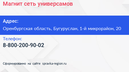 Магнит, сеть универсамов по адресу Оренбургская область, Бугуруслан, 1-й микрорайон, 20 в дальнейшем Организация, размещена в следующих категориях: