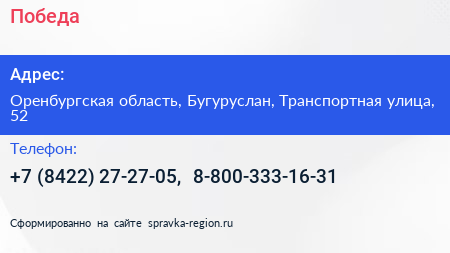Победа по адресу Оренбургская область, Бугуруслан, Транспортная улица, 52 в дальнейшем Организация, размещена в следующих категориях: