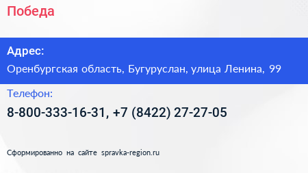 Победа по адресу Оренбургская область, Бугуруслан, улица Ленина, 99 в дальнейшем Организация, размещена в следующих категориях: