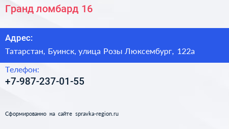 Гранд ломбард 16 по адресу Татарстан, Буинск, улица Розы Люксембург, 122а в дальнейшем Организация, размещена в следующих категориях: