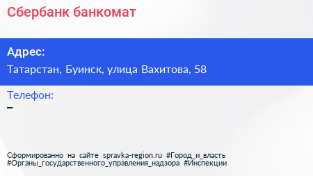 Сбербанк, банкомат по адресу Татарстан, Буинск, улица Вахитова, 58 в дальнейшем Организация, размещена в следующих категориях: