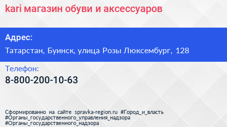 kari, магазин обуви и аксессуаров по адресу Татарстан, Буинск, улица Розы Люксембург, 128 в дальнейшем Организация, размещена в следующих категориях: