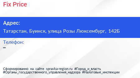 Fix Price по адресу Татарстан, Буинск, улица Розы Люксембург, 142Б в дальнейшем Организация, размещена в следующих категориях: