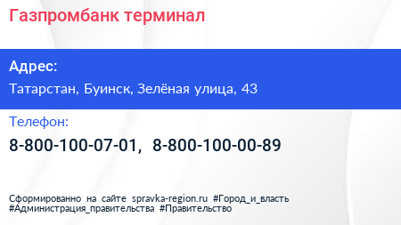 Газпромбанк, терминал по адресу Татарстан, Буинск, Зелёная улица, 43 в дальнейшем Организация, размещена в следующих категориях: