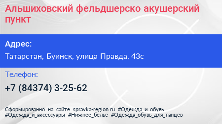 Альшиховский фельдшерско-акушерский пункт по адресу Татарстан, Буинск, улица Правда, 43с в дальнейшем Организация, размещена в следующих категориях: