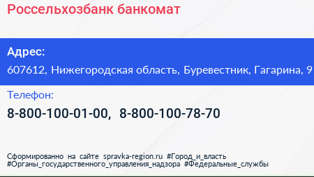 Россельхозбанк, банкомат по адресу 607612, Нижегородская область, Буревестник, Гагарина, 9 в дальнейшем Организация, размещена в следующих категориях: